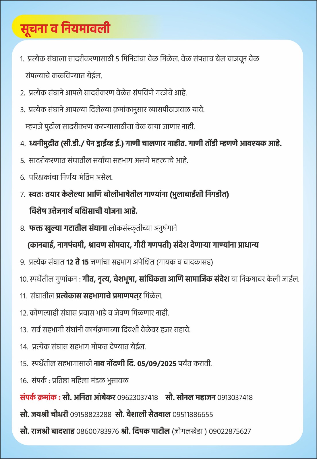 - गीत, नृत्य, वेशभूषा, सांघिकता आणि सामाजिक संदेश या निकषांवर गुणांकन केले जाईल.