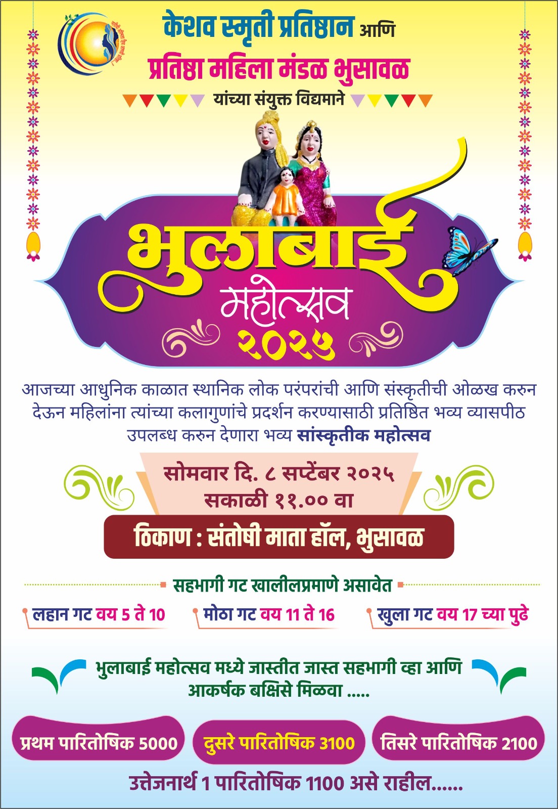भुसावळ : स्थानिक लोकपरंपरा, संस्कृती व लोककला यांना भक्कम आधार देण्यासाठी तसेच महिलांना आपल्या कलागुणांचे प्रदर्शन करण्यासाठी व्यासपीठ उपलब्ध करून देण्याच्या उद्देशाने केशव स्मृती प्रतिष्ठान आणि प्रतिष्ठा महिला मंडळ, भुसावळ यांच्या संयुक्त विद्यमाने भव्य भुलाबाई महोत्सवाचे आयोजन करण्यात आले आहे. हा भव्य सांस्कृतिक सोहळा सोमवार, दि. ८ सप्टेंबर २०२५ रोजी सकाळी ११.०० वाजता संतोषी माता हॉल, भुसावळ येथे पार पडणार आहे.